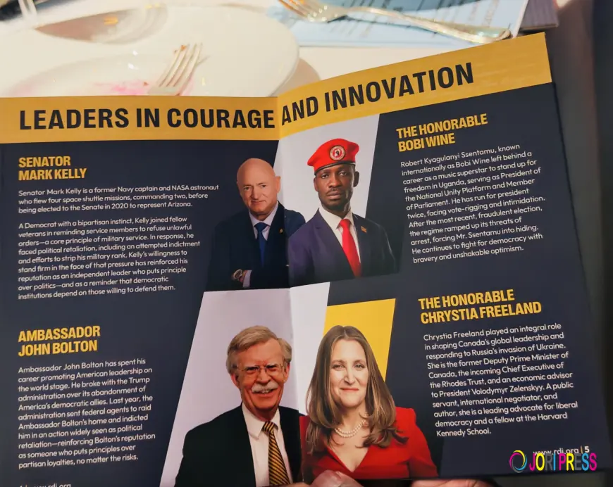 Ugandan opposition leader Bobi Wine real name Robert Sentamu received the 'Leader in Courage and Innovation' award at the Renew Democracy Initiative's gala in New York City, alongside figures like John Bolton and Mark Kelly.