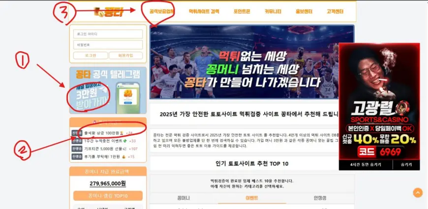 (사진 설명 : 꽁타사이트 메인화면과 빨간색 동그라미와 숫자표기)