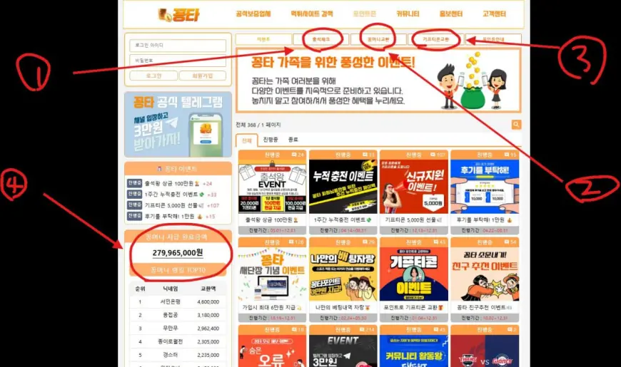 (사진 설명 : 꽁타사이트 이벤트 게시판 화면과 빨간색 동그라미와 숫자표기)