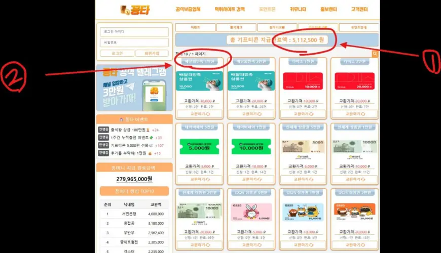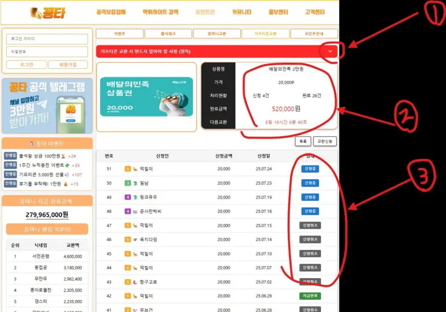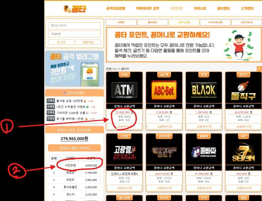 (사진 설명 : 꽁타사이트 꽁머니 교환페이지와 빨간색 동그라미와 숫자표기)