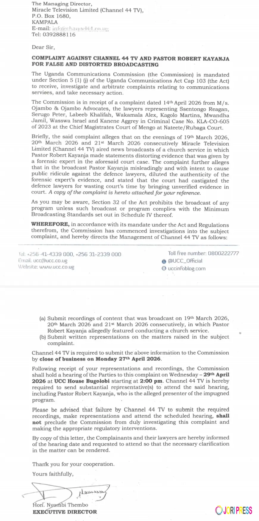 The Uganda Communications Commission (UCC) acting under Section 5(1) (i) of the Uganda Communications Act, and Section 32 of the Act, which requires broadcasters to comply with minimum broadcasting standards, including accuracy and responsibility in content dissemination has summoned Miracle Television Limited (Channel 44) and the Seniour Pastor of Miracle Center Church Prs. Robert Kayanja to explain allegations of false and distorted broadcasting.